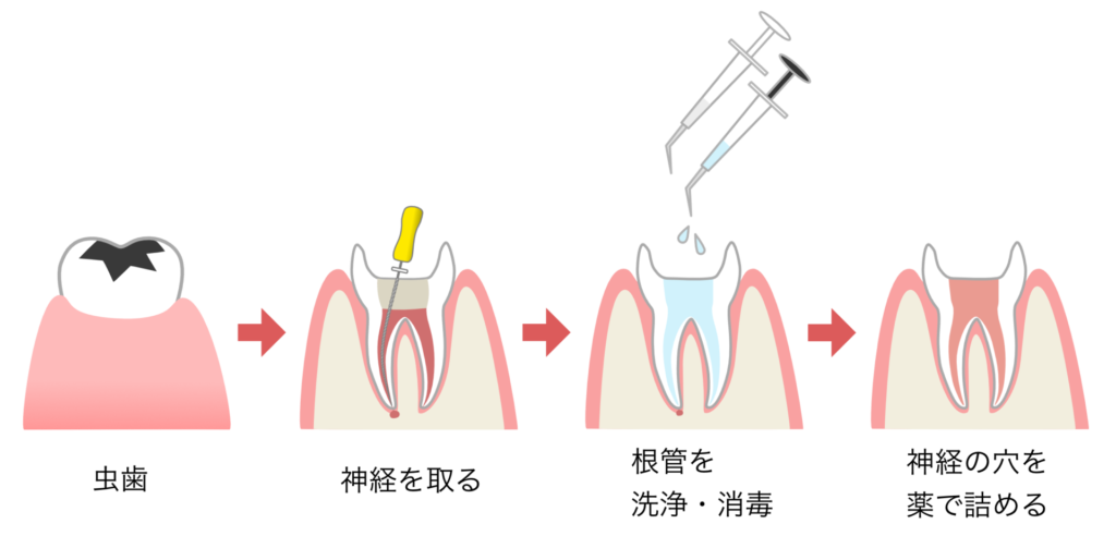 本来歯の神経は、無菌状態で歯の内部に存在するのですが、歯にできた大きな虫歯や、歯にヒビが入った、外傷で歯が折れてしまったなどが原因で、歯の神経が細菌感染を起こしてしまいます。