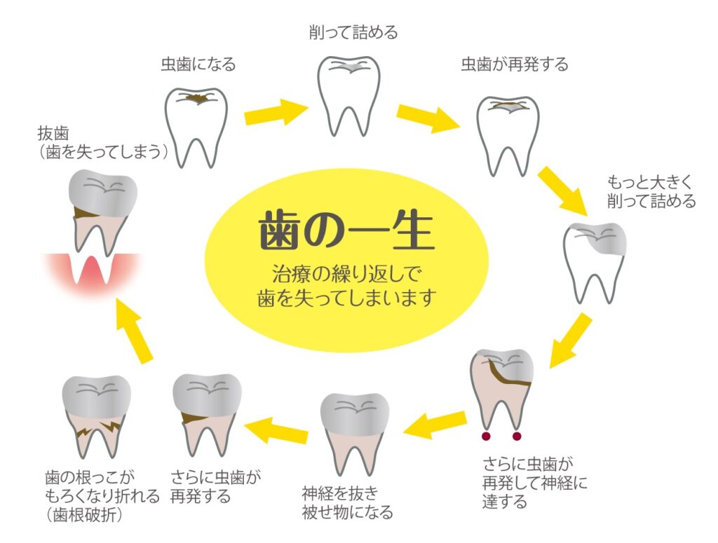ですので、むし歯の治療をすればするほど、自分の歯はなくなっていきますし、自分の歯が無くなればなくなるほど抜歯(歯を抜く)が近づいていると考えるべきであります。