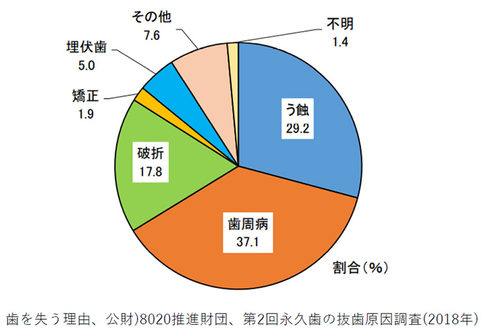 歯を失う原因としては、歯周病、虫歯、歯の破折でほぼ80%以上を占めます。